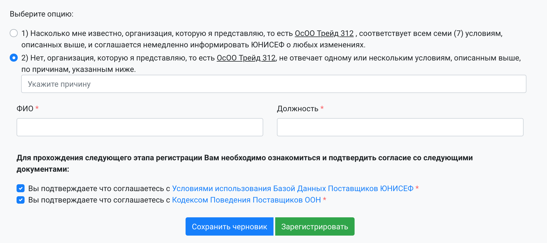 В случае, если по какой-то причине вы не можете закончить заполнение формы и завершить регистрацию, можно нажать на кнопку "Сохранить черновик", тогда все ваши ранее введенные данные сохранятся в системе как черновик и при этом ваша организация не будет официально зарегистрирована. Позже вы можете вернуться к заполнению перейдя на страницу https://vendorcef.org/vendors/new при этом, будет необходимо повторно загрузить документы подтверждающие квалификацию